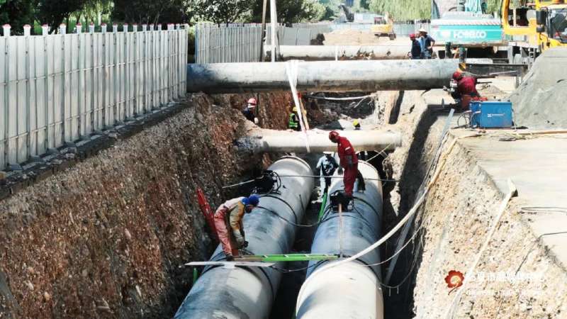 近日,記者來到該工程現(xiàn)場時,起重機正將一根根供熱管道吊起,精準地放進溝槽內;一旁的工作人員有條不紊地將一節(jié)節(jié)供熱管道鋪設、焊接,現(xiàn)場焊花閃爍、機聲隆隆,挖掘機和土方車來來回回,進行溝槽開挖、渣土運送。